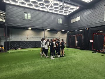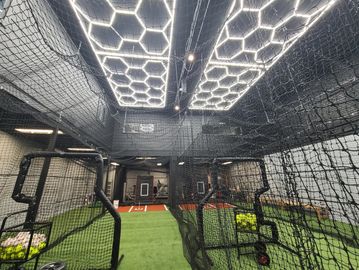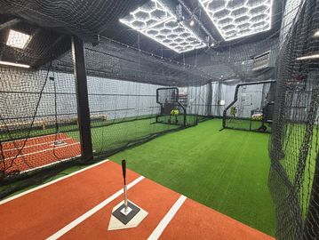 We offer two hitting lanes (12' wide x 42' long) and a full-length pitching tunnel (50' long). Each hitting lane is equipped with a hitting tee, balls, and a combo pitching screen for front toss. Notes: A Yeti Mound 2 pitching machine (baseball/softball) is available with 24 hours’ notice. A feeder 18+ is required. If you need someone to feed balls, please let us know in advance.